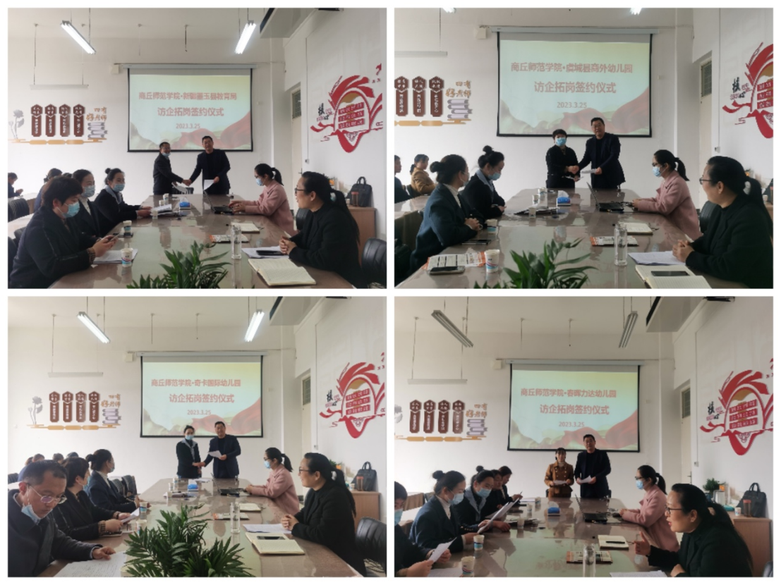 3月25日,以商丘师范学院2023年毕业生春季双向选择洽谈会为契机,国产精品无码亚洲区艳妇于汉梁楼203会议室开展访企拓岗专项行动。学院邀请春晖力达幼儿园、奇卡国际幼儿园、虞城县商外幼儿园、新疆墨玉县教育局等四家单位来我院商谈毕业生实习就业校企合作项目,学院党委书记蒯秀丽、院长孙旭、学工办主任李秀勤、毕业班辅导员赵鋆超以及四家单位相关负责人参加签约仪式。