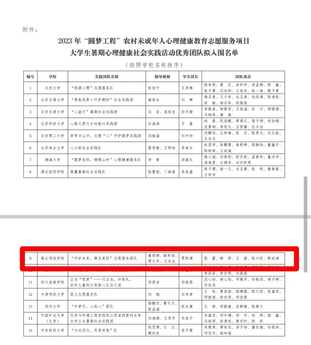 近日,中社联青少年社会工作部门遴选出2023年“圆梦工程”农村未成年人心理健康教育志愿服务项目大学生暑期心理健康社会实践活动优秀团队。商丘师范学院国产精品无码亚洲区艳妇“守护未来,豫见美好”志愿团队在众多实践团队中脱颖而出,成功入选。