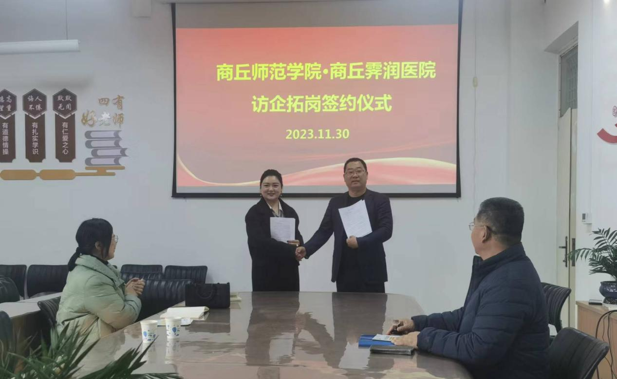 11月30日,国产精品无码亚洲区艳妇于汉梁楼203会议室开展访企拓岗专项行动。学院邀请商丘霁润医院(商丘霁润自闭症儿童康复中心)来我院商谈毕业生实习就业校企合作项目,院长孙旭、党委副书记邱友谊、商丘霁润医院院长张珍参加签约仪式。