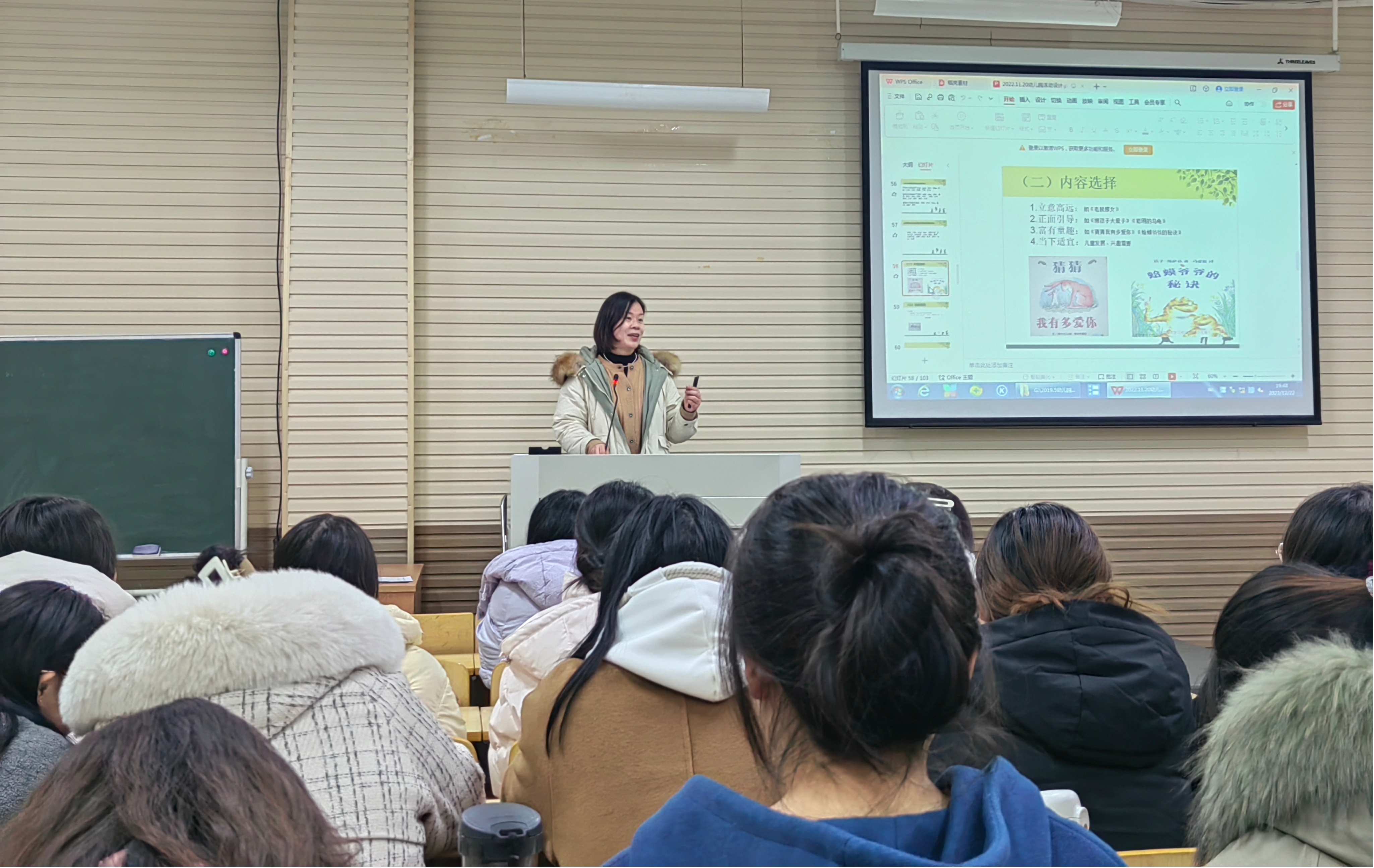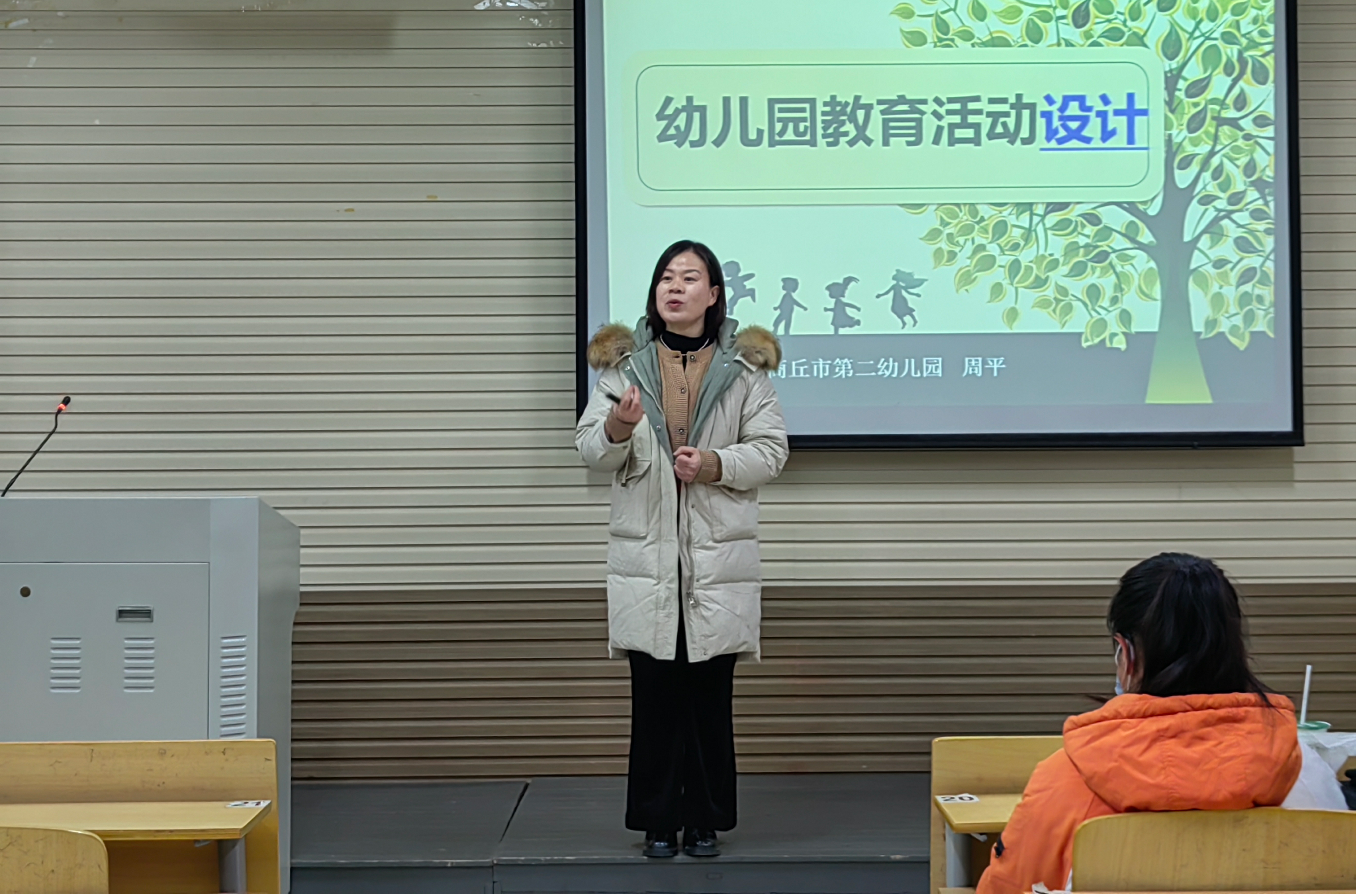 2023年12月22日,国产精品无码亚洲区艳妇“互联网+”学前教育师范生成长工作坊在汉梁楼310教室举办《幼儿园教育活动设计》专题讲座。商丘市第二幼儿园的周平园长作为主讲人,为同学们详细讲解了幼儿园活动设计的要求和细节。