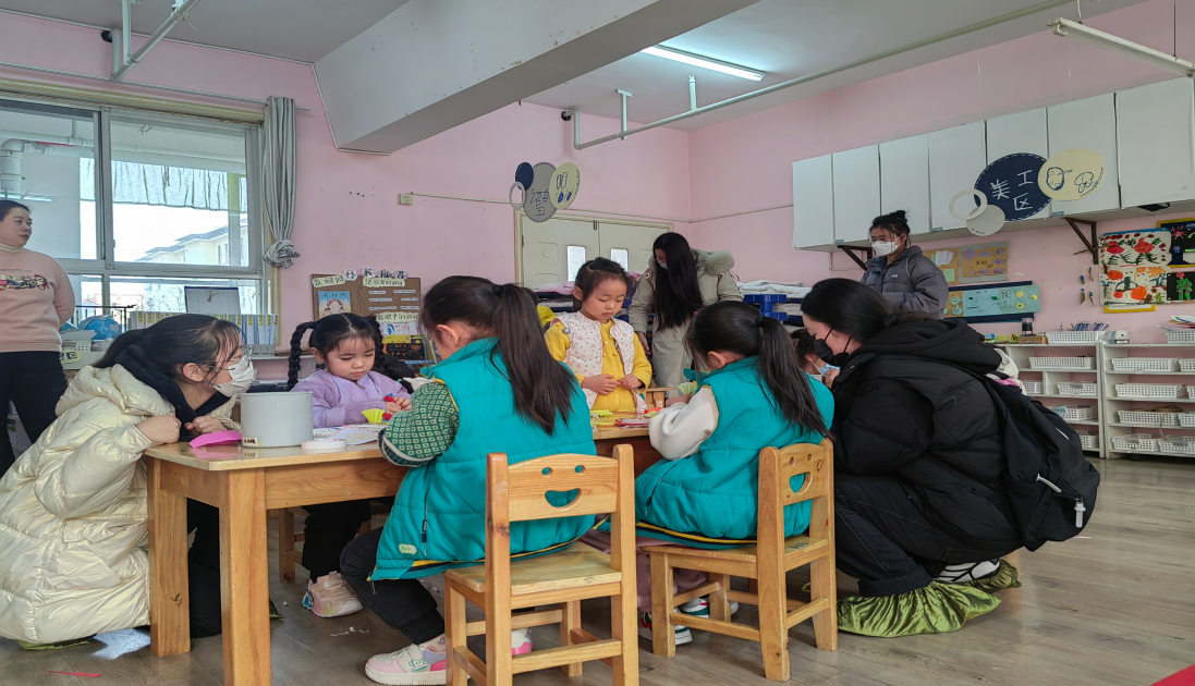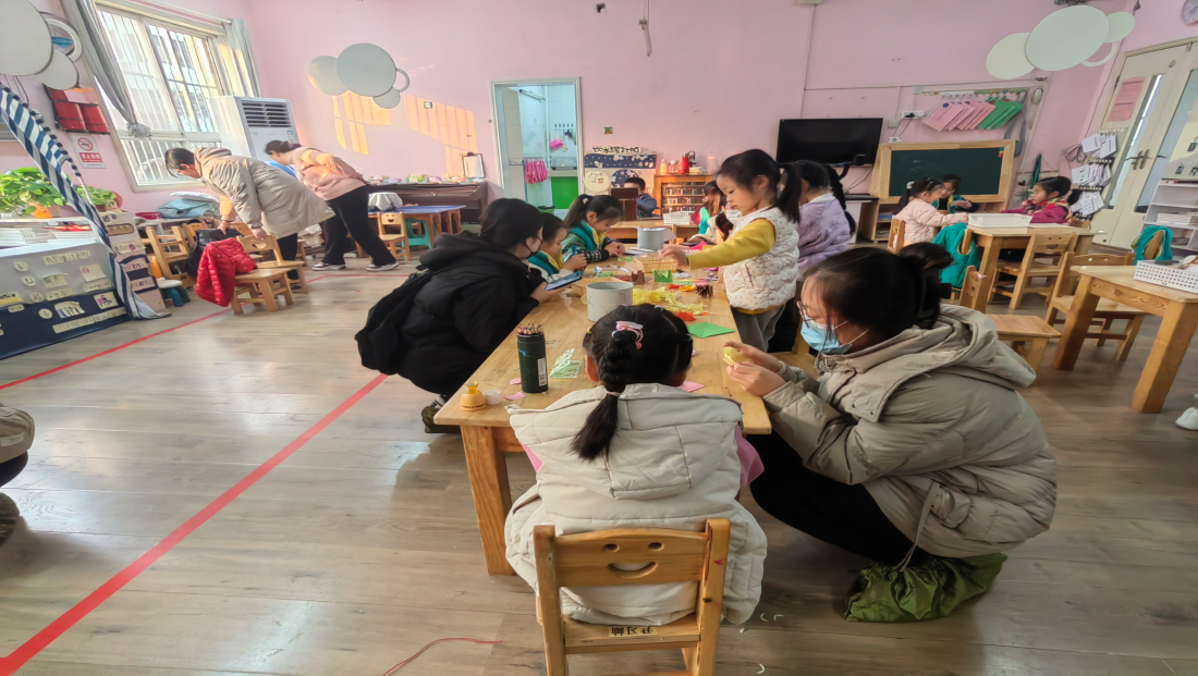 每个区角中都有各种各样丰富的玩教具,以满足幼儿游戏需要,同时能使幼儿在快乐的游戏中成长。部分区角还有幼儿创作的作品摆放陈列,许多幼儿作品与中国传统文化相互融合,班级设计游戏时十分重视中国传统文化,如幼儿用橡皮泥在冬至制作的饺子就被安放在桌面上。玩教具摆放得井井有条,区角一尘不染,教师在活动结束后让幼儿将玩具摆放得当,桌面清理干净。