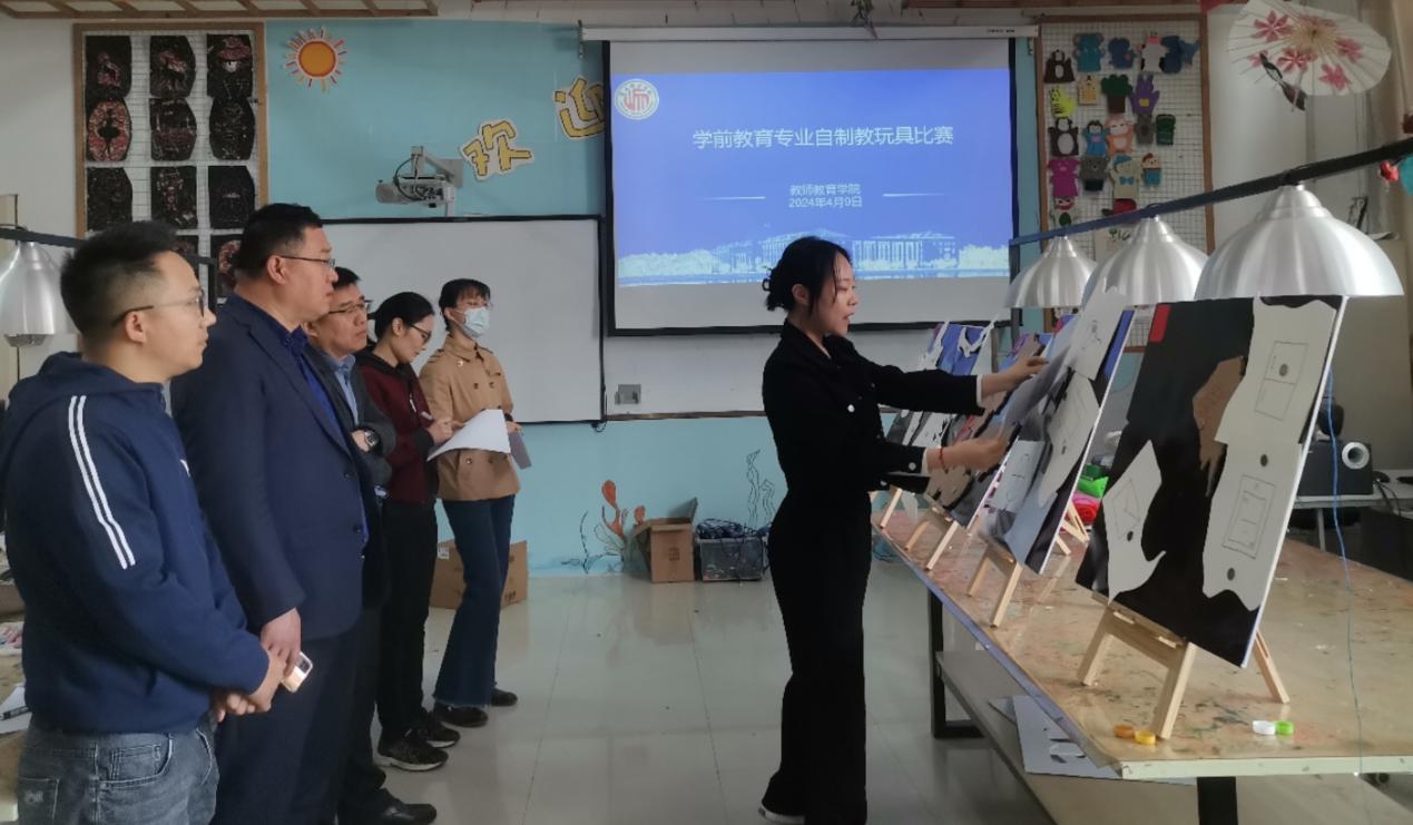 为培养学生创新精神及实践能力,提升学生专业技能,国产精品无码亚洲区艳妇于2024年2月至4月期间举办了学前教育专业自制教玩具比赛,比赛分为初赛和决赛两个环节。同学们积极参赛,共提交作品44项,其中进入决赛的作品7项。4月9日上午,决赛选手于汉梁楼308手工制作实训室进行了作品展示。国产精品无码亚洲区艳妇院长孙旭、副院长李战营及王霞、黄洁、赵一锦、赖生根、李佳佳等老师担任评委。